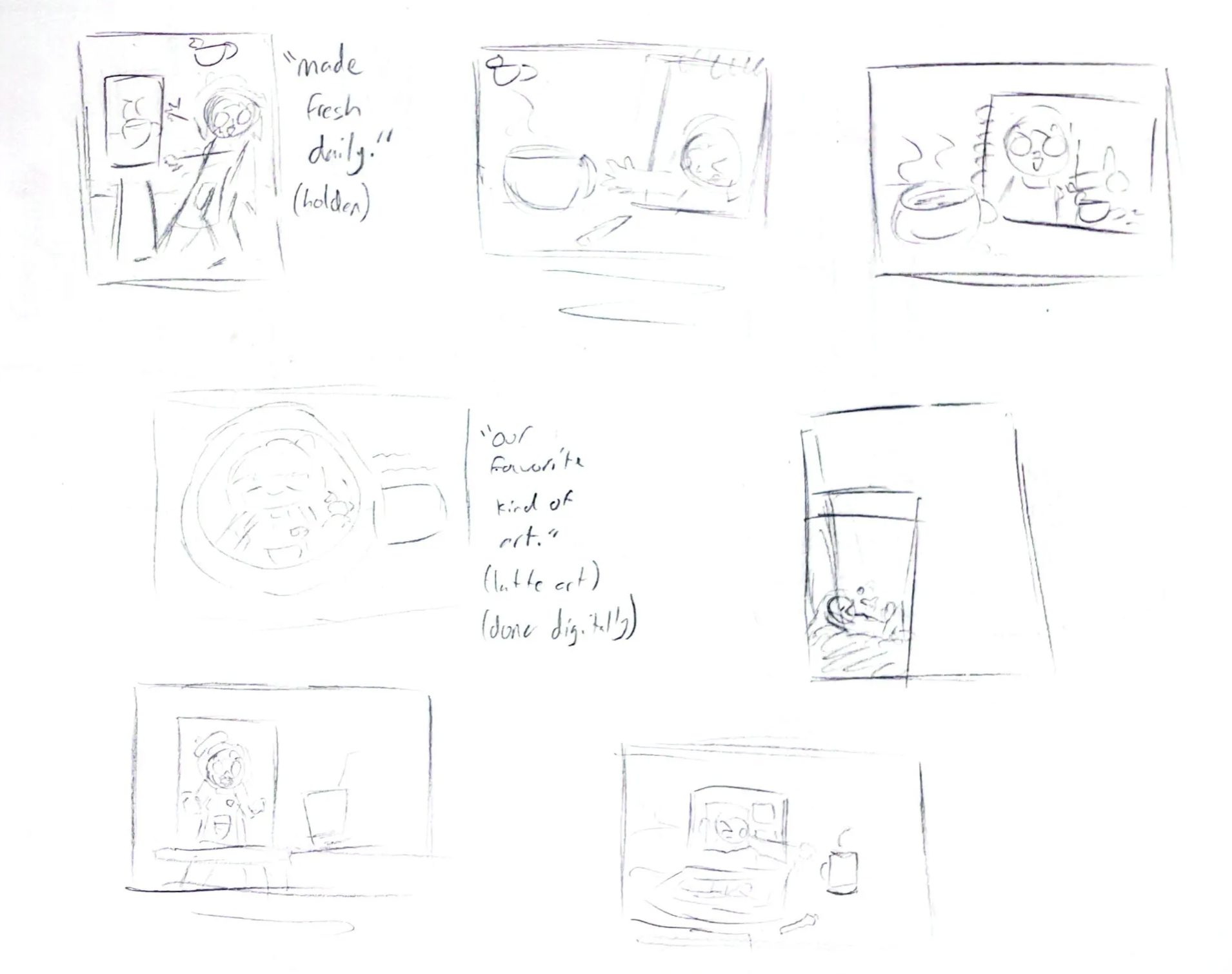 I took inspiration from old cereal commercials in which the mascot would interact with the product, trying very hard despite it often being out of reach. I felt that the characterization of the mascot would in turn help characterize the café’s atmosphere, while simultaneously promoting the various beverages and pastries that are available. Additionally, I utilized a commissioned painting from a friend of mine for one of the advertisements.